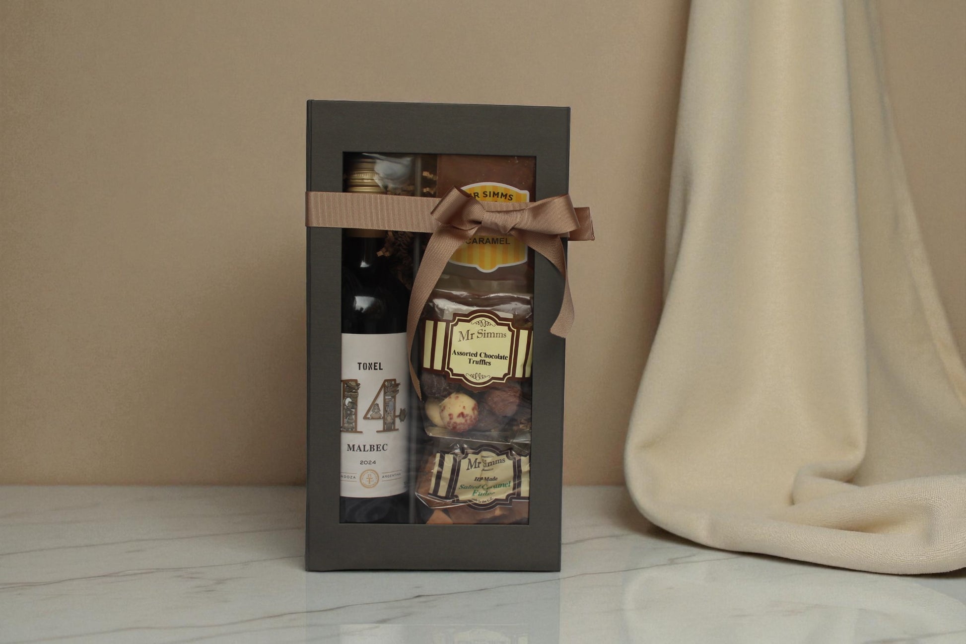 This luxury hamper includes a premium red wine paired with a selection of premium Mr Simms confectionery. Includes a Thank You gift message the following:
